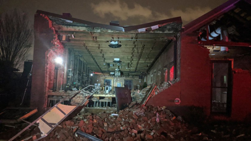 Previous Image Next Image US Severe Weather Tennessee The Geist restaurant brick wall collapsed in a tornado that touched down in downtown Nashville, Tuesday, March 3, 2020. (Alex Carlson via AP)